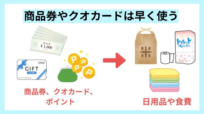 そこで、商品券やクオカードは早めに食費や日用品に消費し、不要なクレジットカードのポントは早く消費して解約することをおススメします。