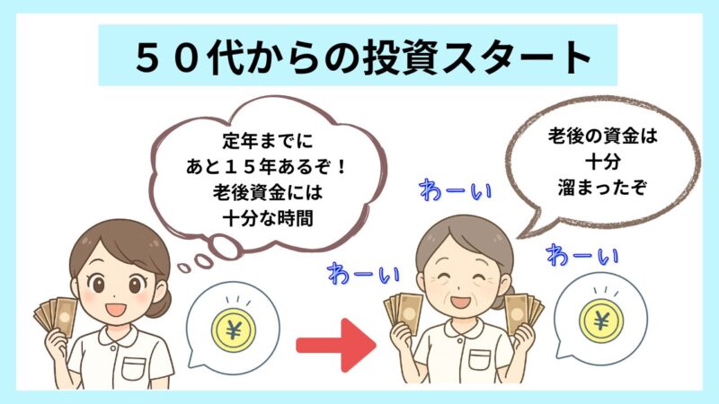 65歳まで働くなら、50歳からでもあと15年は投資できる計算になります。